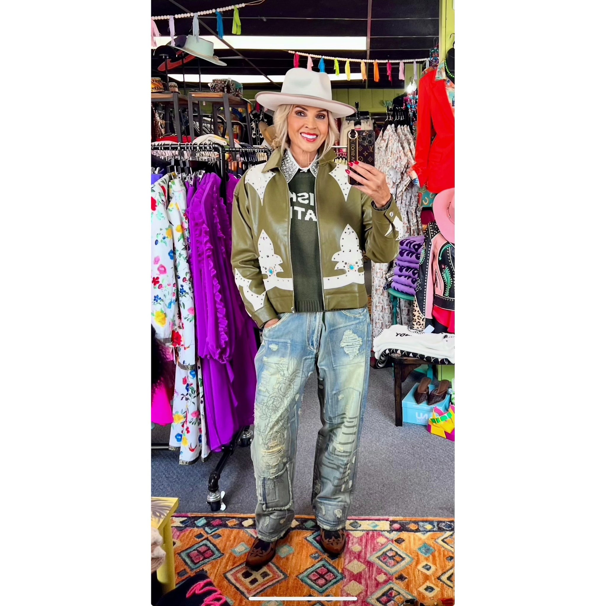 TWO-TONED & TOTALLY TWANGY Show up strong in this sheep suede statement jacket boasting cool contrast details, custom concho buttons,...
