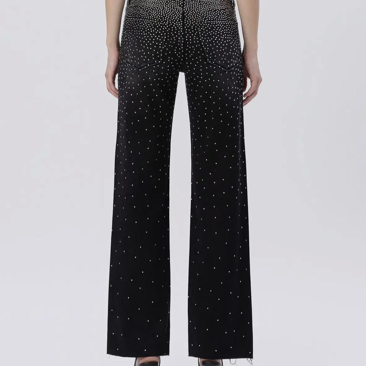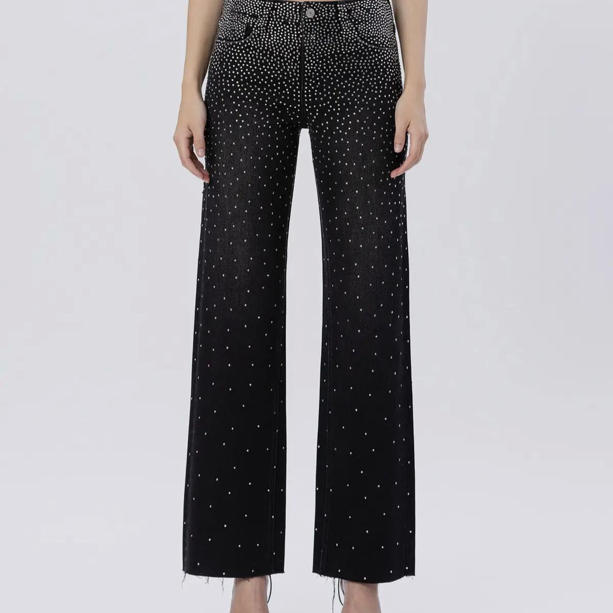 Comfort stretch High-rise Raw hem Slim wide leg May color transfer Some loss of embellishment may occur