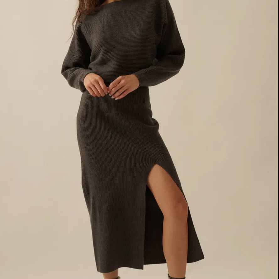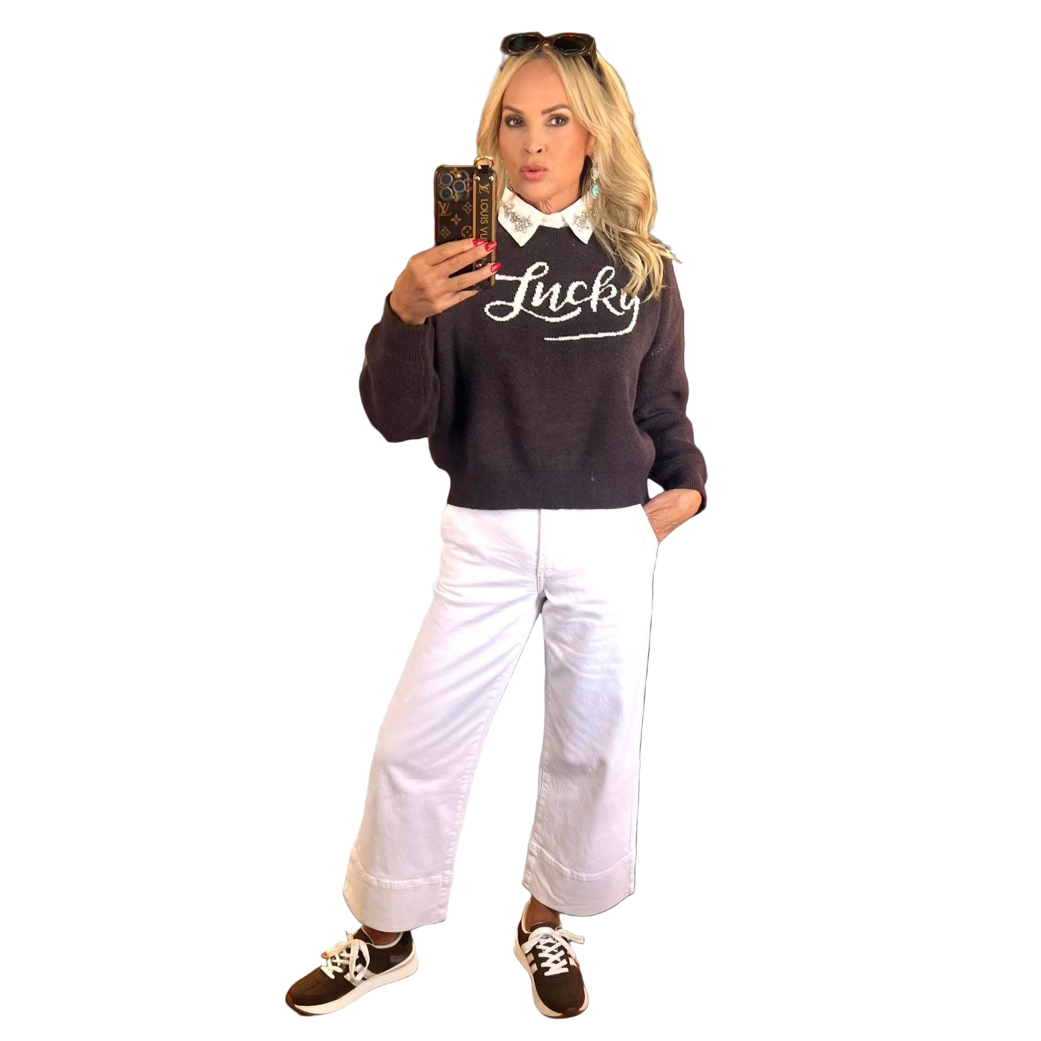 Deep chocolate brown crew neck Lucky weaved into the sweater