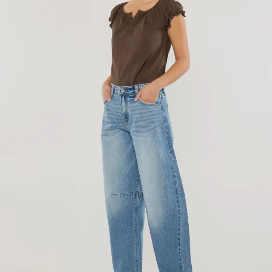 Mid rise crop wide leg jean Medium wash 2% stretch Zipper fly Braided belt loop Raw hem 4” cuff