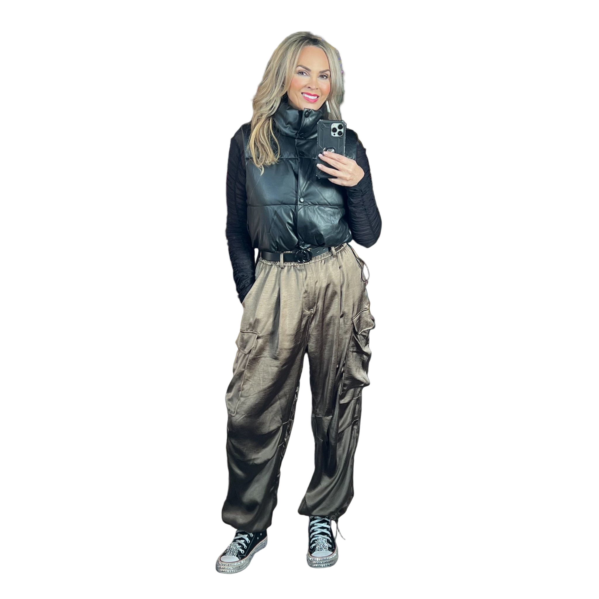Silky band waist Wide leg Cargo pant Ankle cord Olive color
