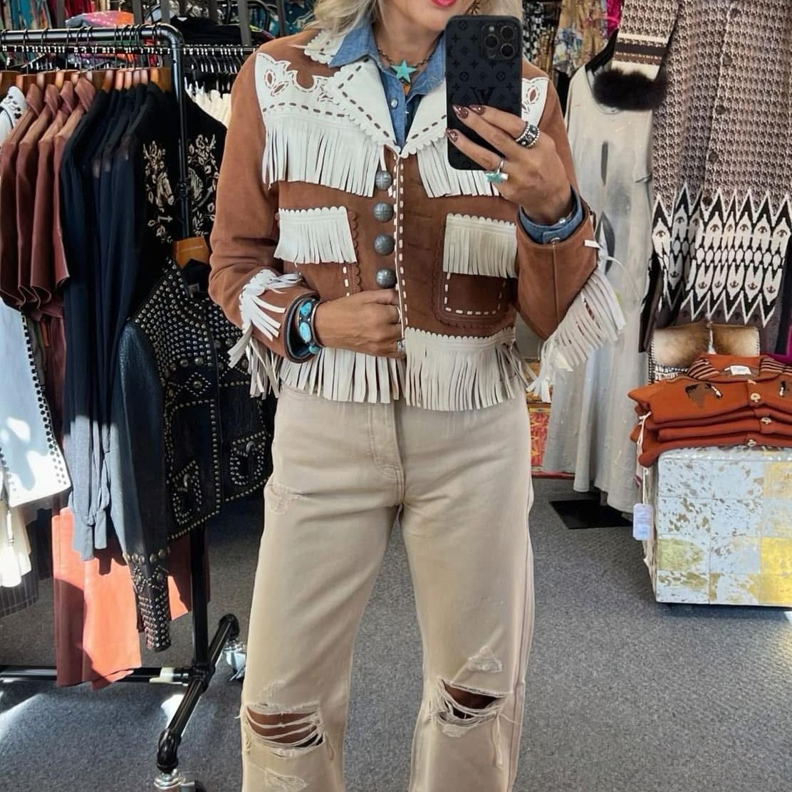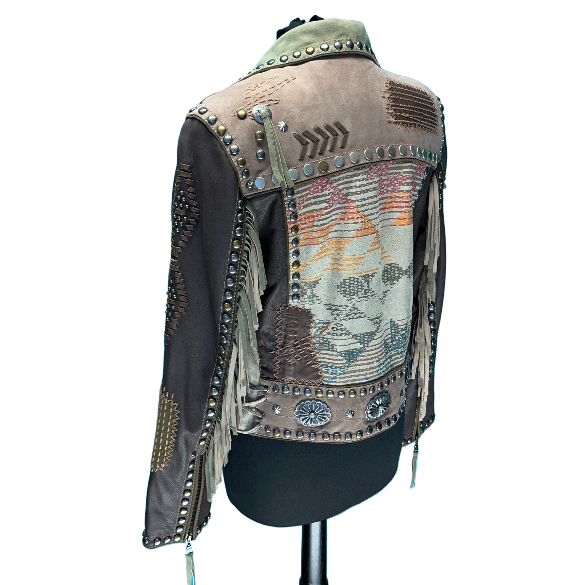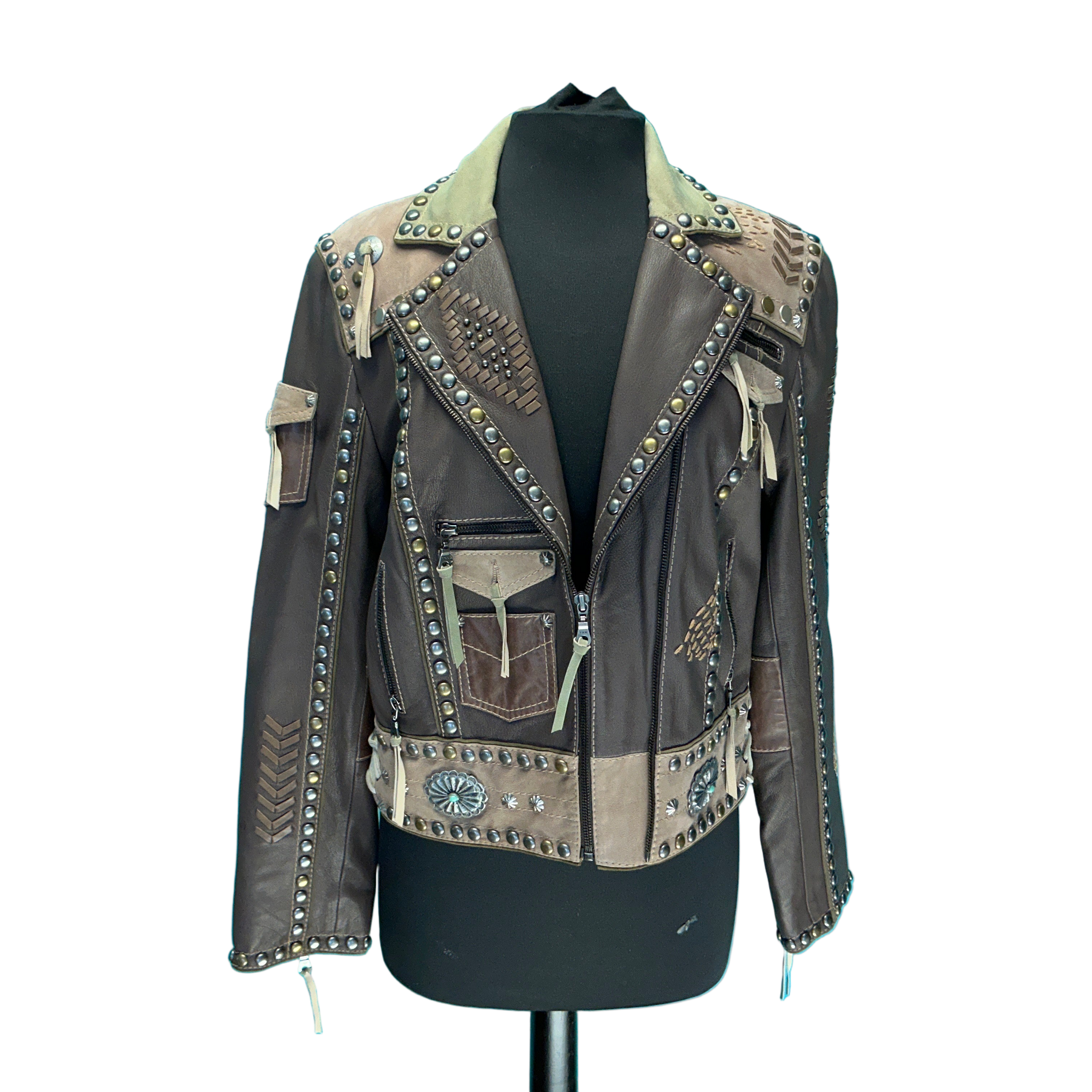 Large DD Cropped Jacket Beaded Sleeve Leather Fringe Brass Studs 25” Sleeve length 23” Chest measurement 25” Back length