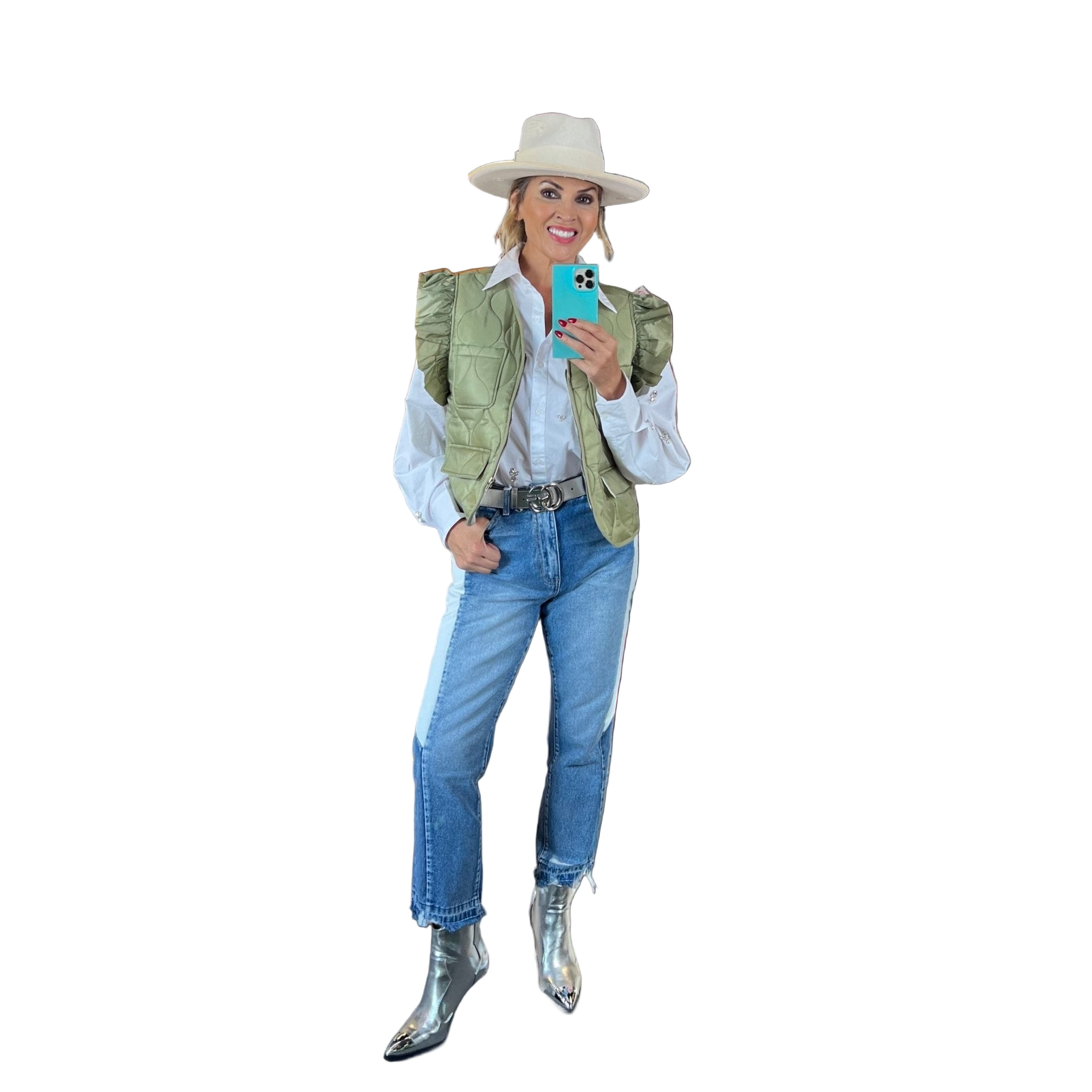 "Transform your outfit with our luxurious green vest, featuring delicately ruffled sleeves. Perfect for a chic and sophisticated look, this...